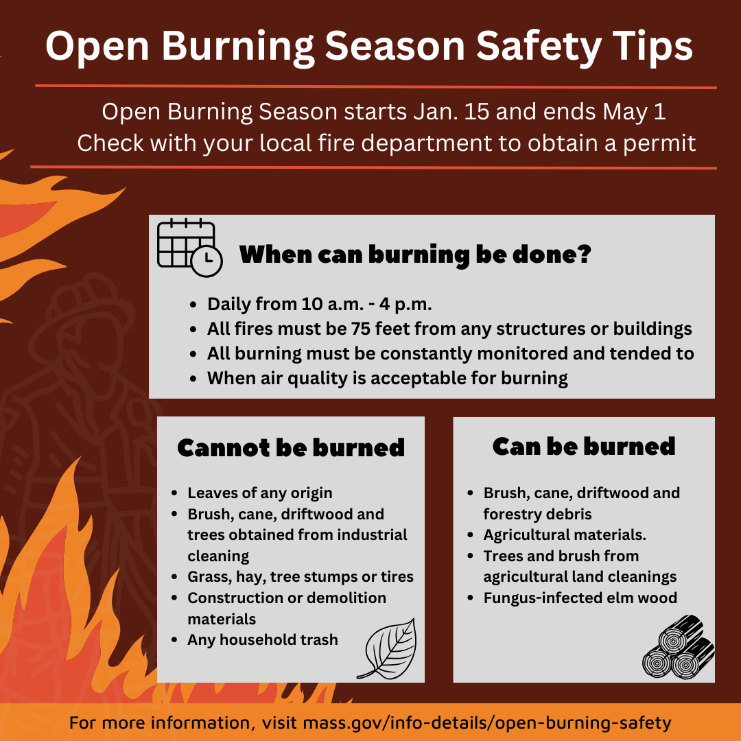 The 2026 Open Burning Season begins on Thursday, Jan. 15, and ends on May 1. Open burning during this period is governed by the following regulations: Issuance of permit by local fire department, only permitted between 10 a. m. and 4 p.m. daily, must be 75 feet from any building or structure, and constant attendance…