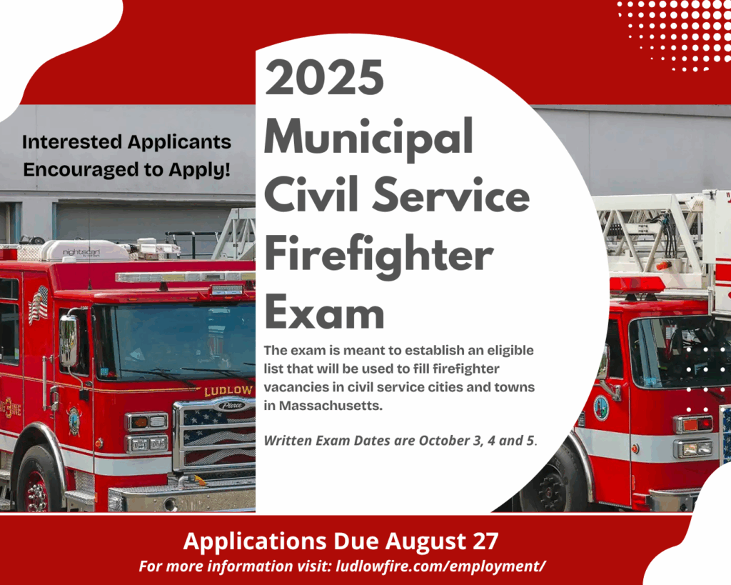 Ludlow Fire would like to share the following information about the civil service exam, which will be held in October. Applications are now open and due by Aug. 27.