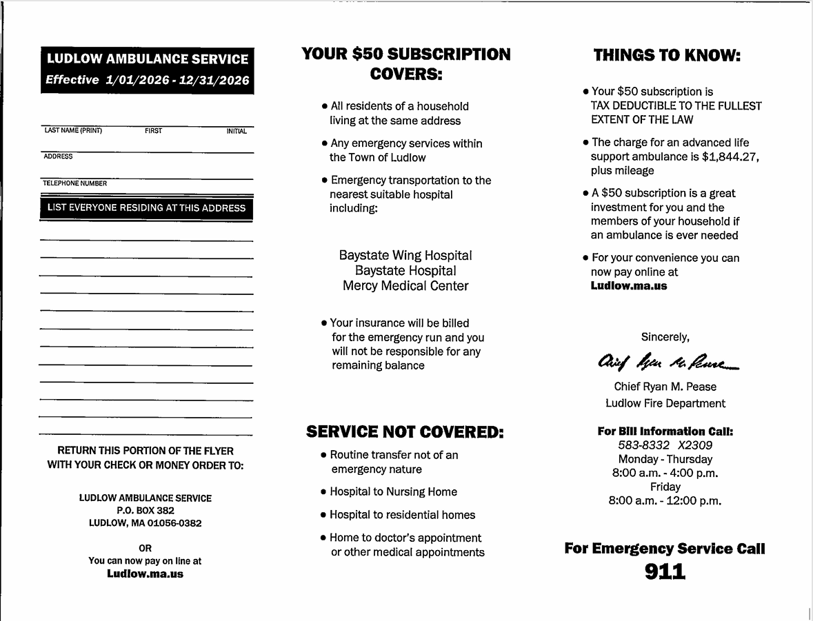 Ludlow Fire mails our subscription forms every year by early November for residents to sign-up.