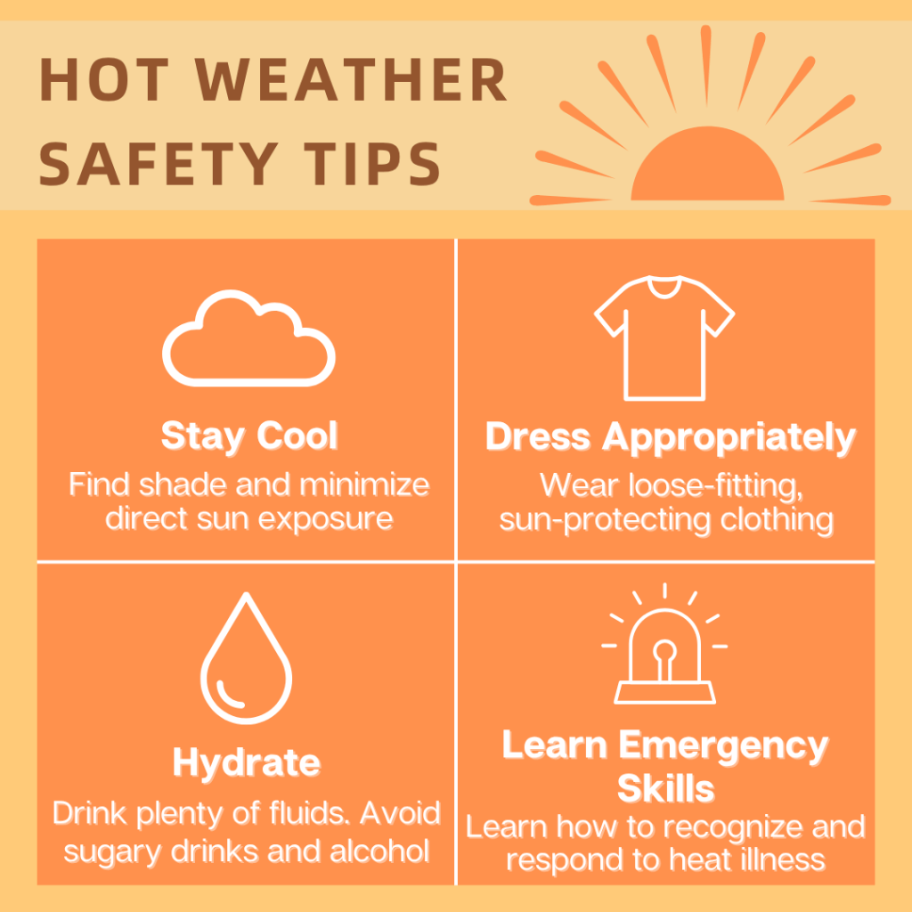 To help residents keep themselves and their loved ones safe, the department would like to share the following hot weather safety tips from the American Red Cross: