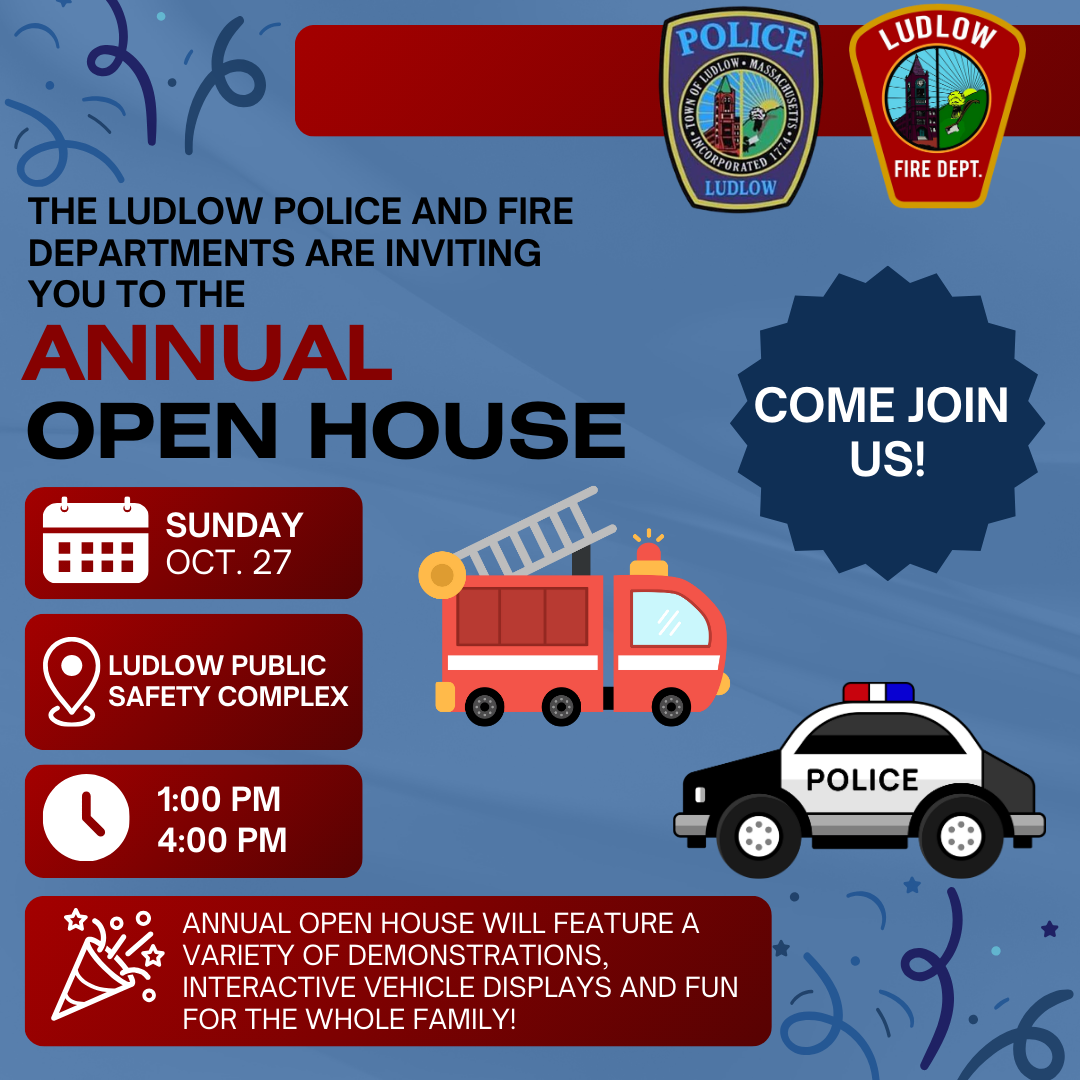 LUDLOW — Police Chief Daniel Valadas and Fire Chief Ryan Pease are pleased to share that Ludlow Police and Fire are hosting an open house. WHEN: Sunday, Oct. 27 from 1-4 p.m. WHERE: Ludlow Public Safety Complex, 612 Chapin St. WHAT: Ludlow Police and Fire will be hosting an open house and are welcoming community members to attend. Ludlow Public Health and Emergency Preparedness and representatives from Ludlow Cares Coalition and the Michael Dias…